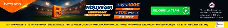 ➡️ Si ton premier pari est perdant : ne t’inquiète pas, Betsson te rembourse 100% de ta mise (jusqu’à 100€) sous forme de Betboost (crédits de jeu, aussi appelés freebets), dans un délai de 3 jours.